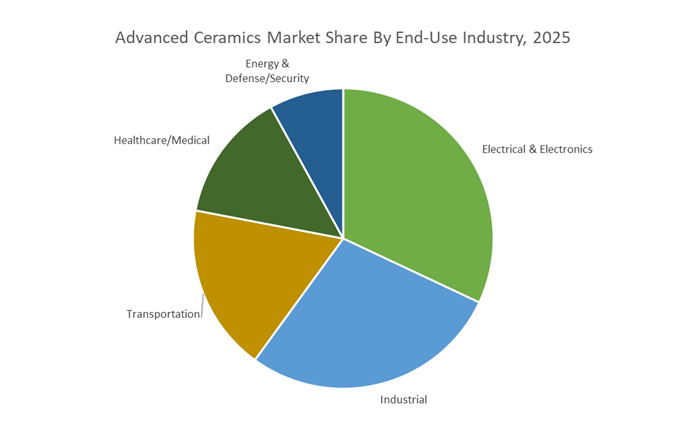 Electrical & Electronics is the largest end-use segment with a 32.2% share in 2025, driven by the explosive rise in semiconductor demand, the proliferation of MLCCs, and the rapid transition toward wide-bandgap power devices. Advanced ceramics are essential to the global electronics ecosystem, serving as dielectric materials in capacitors, substrates for integrated circuits, packages for high-frequency communication devices, and enablers for SiC-based power modules used in EVs and renewable energy converters. This segment’s dominance stems from the convergence of electrification, digitalization, and 5G/IoT deployment—all strong structural growth drivers. Complementary industry segments reinforce long-term market resilience: industrial applications provide reliable demand for wear-resistant and chemically inert ceramics; transportation increasingly depends on ceramics for sensors, emissions systems, and EV power electronics; healthcare relies on bioceramics for implants, dental applications, and imaging components; and energy & defense continue to invest in advanced ceramics for turbine engines, armor systems, and high-temperature insulation.