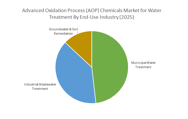 Municipal water treatment holds the largest share among end-use industries in the AOP chemicals market, capturing around 48.2% of the market in 2025. This leadership position is driven by stringent global regulatory standards aimed at achieving superior disinfection, pathogen inactivation, and micropollutant removal in municipal drinking water systems. The escalating concerns about public health and safety, coupled with regulatory mandates, continuously propel demand for advanced oxidation processes within municipal facilities. Conversely, groundwater and soil remediation emerges as the fastest-growing end-use segment, projected to grow at a robust rate of 10.2% CAGR during the forecast period. This accelerated growth is primarily due to rising global attention toward remediation of contaminated sites, including those impacted by persistent chemicals such as per- and polyfluoroalkyl substances (PFAS), chlorinated solvents, and hydrocarbons. Industrial wastewater treatment is also experiencing substantial growth, particularly driven by rapidly expanding sectors such as pharmaceuticals, textiles, and chemicals, demanding efficient AOP solutions to achieve stringent effluent standards.