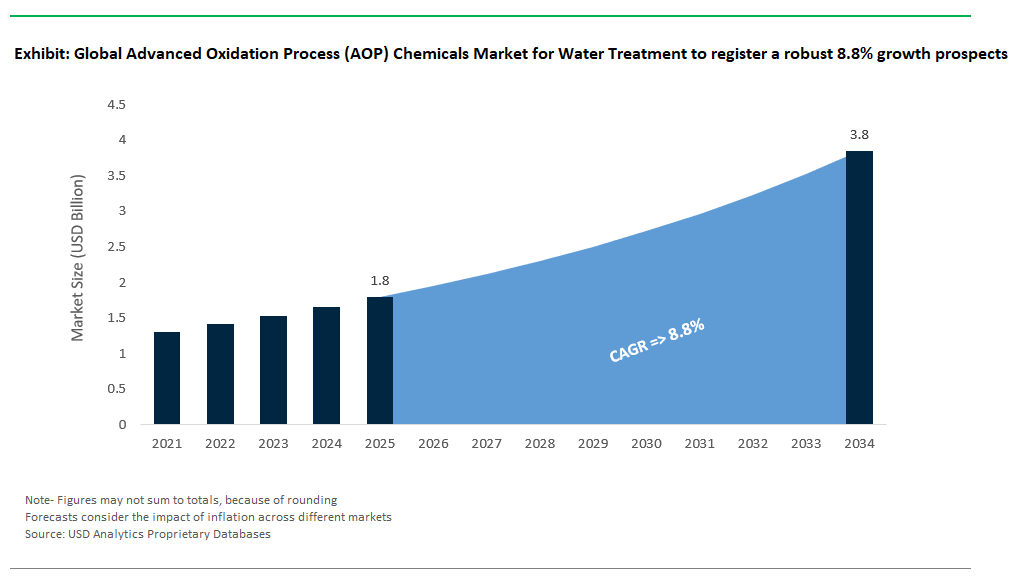 The AOP chemicals market is valued at $1.8 billion in 2025 and is projected to exceed $3.8 billion by 2034, growing at a CAGR of 8.8%. This growth is driven by the rising demand for technologies capable of eliminating persistent organic pollutants, PFAS, pharmaceuticals, and micropollutants that traditional water treatment systems cannot effectively manage.