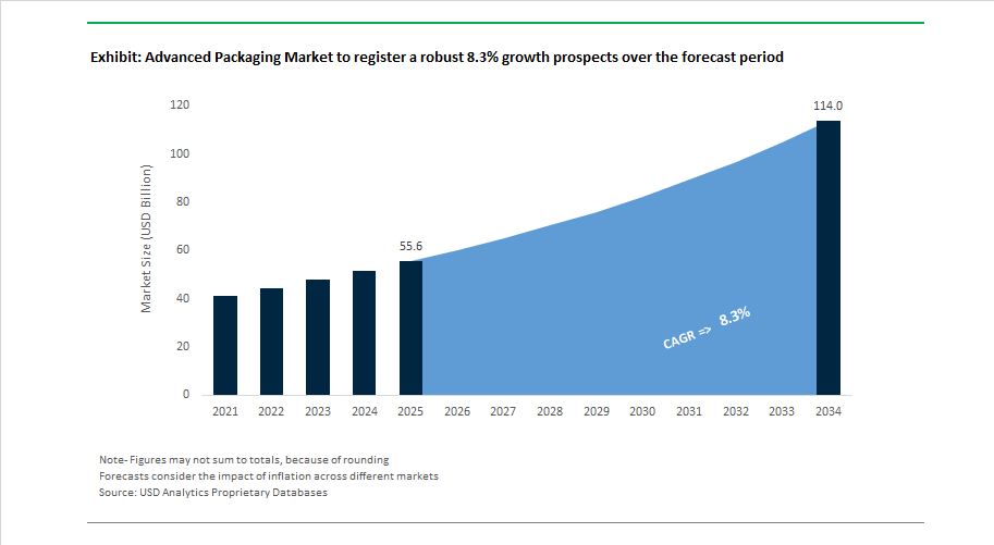 The Advanced Packaging Market is valued at $55.6 billion in 2025 and is projected to reach $114 billion by 2034, expanding at an 8.3% CAGR. Growth is powered by AI accelerators, high-performance computing, HBM memory stacking, and heterogeneous integration as packaging becomes the primary driver of bandwidth, power efficiency, and thermal performance.