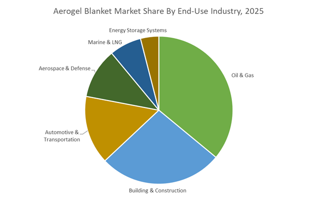Oil & gas represent roughly 36% of aerogel blanket demand in 2025, supported by subsea pipeline insulation and refinery steam tracing where reduced thickness and weight advantages are critical for offshore platforms. Building & construction ranks second, driven by net-zero retrofits, Passivhaus specifications, and historic preservation projects under policy incentives such as EU renovation programs and US tax credits. Automotive & transportation is the fastest-growing segment, propelled by EV battery thermal management requirements and safety standards mandating thermal runaway mitigation, making aerogel sheets increasingly standard between lithium-ion cells. Aerospace & defense remain high-margin but low-volume, while marine and LNG applications sustain steady demand in piping and regasification systems. Energy storage systems represent the smallest yet highest-potential segment, with grid-scale battery deployments expected to drive compounded growth beyond 30% through 2030.