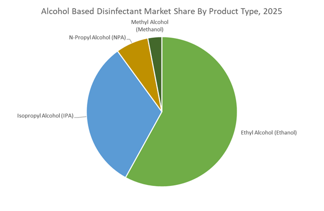 Ethyl alcohol (ethanol) represents approximately 58% of the global alcohol based disinfectant market in 2025, maintaining clear dominance due to its favorable safety profile, low dermal toxicity, and endorsement by WHO and FDA guidelines requiring minimum 60% concentration for effective hand sanitization. Denatured ethanol formulations remain standard for hand sanitizers and skin antiseptics. Following pandemic-driven oversupply and inventory destocking in 2023 to 2024, demand has stabilized at structurally elevated levels versus 2019. Isopropyl alcohol (IPA) ranks second, widely used for surface disinfection, medical prep pads, pharmaceutical cleanrooms, and electronics manufacturing due to rapid evaporation and minimal residue. N-propyl alcohol holds a small, specialized share, constrained by toxicity concerns and EU cosmetic restrictions. Methanol accounts for the smallest legitimate share, restricted to industrial applications or denaturant use, with regulatory crackdowns significantly limiting improper sanitizer use.