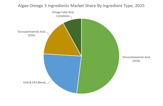 Docosahexaenoic acid (DHA) accounts for approximately 52% of the global algae omega 3 ingredients market in 2025, reflecting its central role in brain development, cognitive performance, and visual health. DHA is the mandated omega-3 fortification standard in infant formula across major regulatory markets, creating structurally stable demand. Algal DHA has achieved near price parity with fish oil alternatives while offering superior oxidative stability and freedom from marine contaminants such as mercury and PCBs, strengthening its appeal in clean-label formulations. DHA & EPA blends rank second and represent the fastest-growing segment, supported by adult cardiovascular and prenatal supplement demand as fermentation technologies narrow the algal EPA cost gap. Standalone EPA remains high value but capacity constrained due to complex biosynthesis in specialized strains. Omega fatty acid complexes form the smallest niche, positioned as premium vegan full-spectrum alternatives with limited mass-market penetration.
