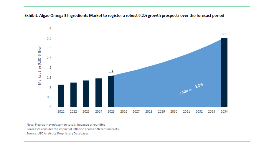 The Algae Omega-3 Ingredients Market was valued at $1.6 billion in 2025 and is forecast to reach $3.5 billion by 2034, expanding at a robust 9.2% CAGR. Growth is driven by rising DHA demand in infant nutrition, EPA adoption in supplements, aquafeed substitution of fish oil, and large-scale heterotrophic fermentation capacity expansion.