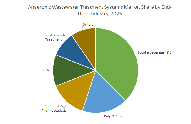 Among end-user industries, Food & Beverage leads with 35.7% share, driven by high COD/BOD, biodegradable wastewater streams that deliver high biogas yields and operational savings. Pulp & Paper (16.9%) and Landfill Leachate Treatment are well-established sectors utilizing anaerobic systems for efficient wastewater stabilization and energy recovery. Chemicals & Pharmaceuticals (12–16%) and Textile (10–14%) represent complex but high-value markets, requiring specialized pre-treatment and advanced reactor technologies, yet offering substantial benefits in energy recovery, operational efficiency, and regulatory compliance.
