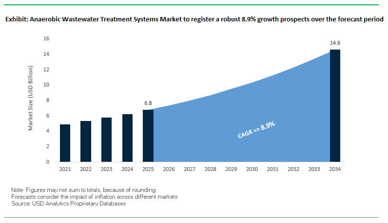 The anaerobic wastewater treatment systems market is projected to grow from USD 6.8 billion in 2025 to USD 14.6 billion by 2034, registering a robust CAGR of 8.9%. This high growth trajectory reflects the increasing global demand for energy-efficient, resource-recovering wastewater treatment technologies. Unlike conventional aerobic methods, anaerobic processes convert organic pollutants into biogas, offering a sustainable solution for industries with high-strength effluents, such as food and beverage, pulp and paper, and textiles.
