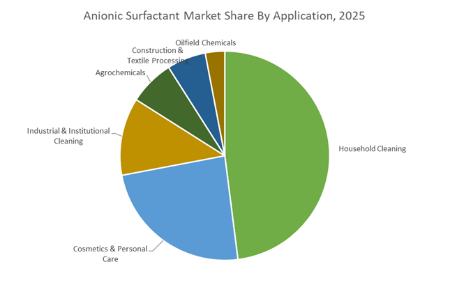 Household cleaning represents roughly 48% of anionic surfactant consumption in 2025, spanning laundry formats (powder, liquid, pods), hand dishwashing, automatic dishwashers, and hard-surface cleaners, with LAS and AES dominating volume. While formulation concentration reduces product weight, surfactant intensity per dose is rising, keeping demand resilient and population-linked. Cosmetics & personal care rank second and deliver the highest margins, covering shampoos, body washes, facial cleansers, and toothpaste, where AES remains central, SLS is being phased down, and amino acid anionics are gaining share under sulfate-free reformulation, supporting 5–7% growth in developed markets and higher in Asia. Industrial & institutional cleaning is stable and specification-driven, led by LAS and phosphate esters. Agrochemicals rely on lignosulfonates and phosphate esters for emulsification and dispersion. Construction & textiles remain mature, while oilfield chemicals form the smallest but high-value segment, with AOS preferred for high-salinity reservoirs amid cyclical recovery.