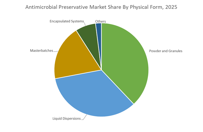 Powder and granule formats account for approximately 38% of antimicrobial preservative demand in 2025, retaining leadership due to low logistics cost, long shelf life, and compatibility with dry blending in paints, construction mixes, pharmaceutical tablets, and polymer compounding. Sodium benzoate, potassium sorbate, calcium propionate, and silver–zinc zeolites dominate this category, particularly in emerging markets where cold-chain infrastructure is limited. Liquid dispersions follow closely, favored in water-based paints, adhesives, sealants, and personal care for dust-free handling and automated dosing, with isothiazolinones (BIT, MIT, CMIT) and organic acids leading volumes. Masterbatches remain critical for plastics, enabling safe incorporation into PE, PP, and PET for medical devices and food packaging. Encapsulated preservative systems are the fastest-growing segment, enabling controlled release, thermal stability during extrusion, and reduced leaching in long-life coatings and textiles, despite higher unit costs.