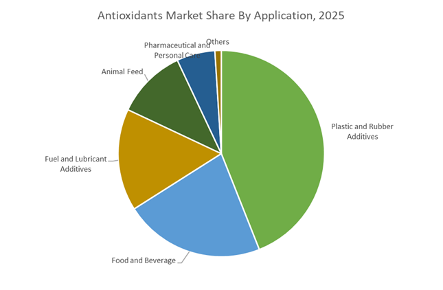 Plastic and rubber additives account for roughly 44% of total consumption. Antioxidants prevent thermal-oxidative degradation during extrusion and injection molding, protecting PE, PP, ABS, automotive components, wire and cable insulation, and construction materials. Food and beverage preservation ranks second, driven by tocopherols and rosemary extracts replacing BHA and BHT in clean-label products.