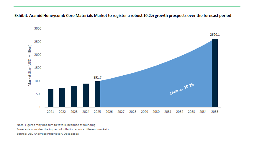 The global Aramid Honeycomb Core Materials Market was valued at USD 991.7 million in 2025 and is forecast to reach USD 2,619.4 million by 2035, expanding at a CAGR of 10.2% during 2026–2035. Growth is anchored in aerospace production ramps, FST regulations, and composite-intensive aircraft architectures.