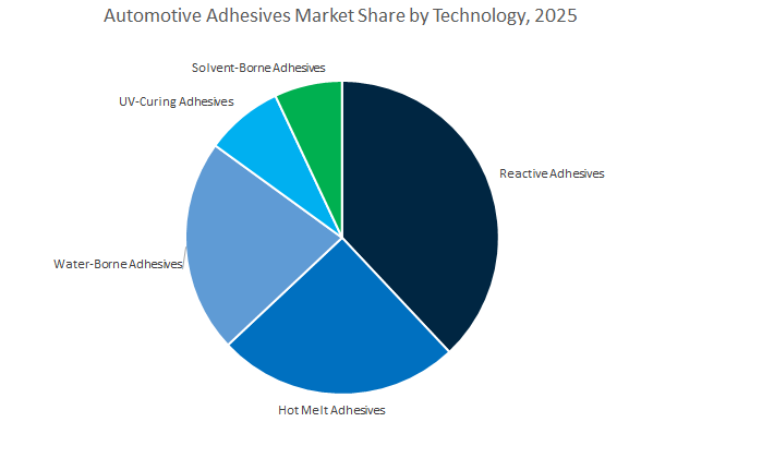 The hot melt adhesives segment, projected to account for approximately 25 percent of the 2025 market, is expanding rapidly due to its speed, efficiency, and compatibility with automated automotive manufacturing. Solvent-free hot melts based on polyolefin, EVA, and reactive PUR chemistries offer instant tack, fast set times, and clean processing for high-speed assembly operations, supporting applications such as interior and trim bonding, seat and carpet lamination, wire harness attachment, and weatherstrip sealing. The rise of reactive PUR hot melts, which combine thermoplastic processing with thermoset-level strength, is further enhancing adoption in both interior and semi-structural bonding. Hot melts also enable VOC-free production and align with Industry 4.0 through robotic dispensing integration, positioning PUR-based systems as one of the fastest-growing technologies in automotive adhesives. In parallel, the water-borne adhesives segment maintains a strong, stable position driven by sustainability requirements and environmental compliance. Acrylic and polyurethane dispersions play a central role in interior bonding applications including headliners, seats, door panels, and carpets, supported by their low VOC emissions, non-flammability, and suitability for occupant-facing cabin environments. Ongoing advances in crosslinking and polymer dispersion technologies have improved their heat and humidity resistance, reinforcing their role as a sustainable, regulatory-compliant alternative as automakers pursue carbon neutrality and broader ESG commitments.