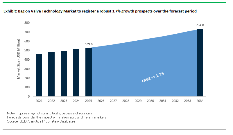 The global Bag-on-Valve (BoV) technology market is projected to expand from USD 529.8 million in 2025 to USD 734.7 million by 2034, registering a CAGR of 3.7%. Growth is underpinned by increasing demand for product purity, safe dispensing, and eco-friendly propellants across industries such as pharmaceuticals, personal care, and food packaging. Unlike traditional aerosol systems, BoV separates the product from the propellant, ensuring integrity, hygiene, and extended shelf life a crucial factor for sensitive applications.