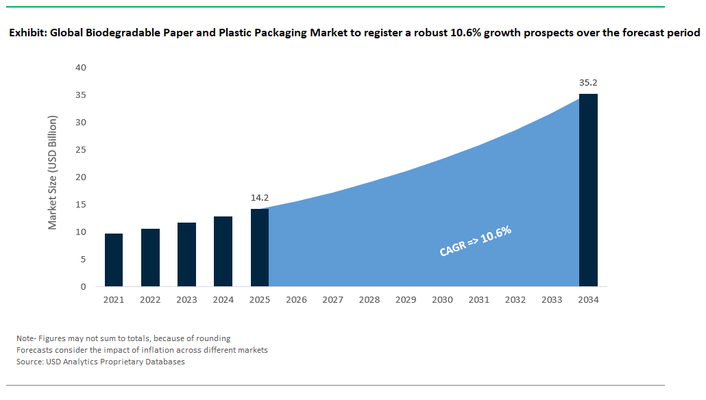 The global biodegradable paper and plastic packaging market is forecast to grow from USD 14.2 billion in 2025 to USD 35.2 billion by 2034, achieving a strong CAGR of 10.6% as sustainability mandates and innovations drive adoption.