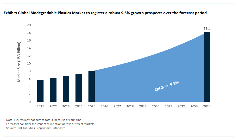 The global biodegradable plastics market is projected to grow from USD 8 billion in 2025 to USD 18.1 billion by 2034, registering a solid CAGR of 9.5% as sustainability and circular economy initiatives accelerate adoption.