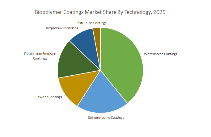 Biodegradable polyesters are the fastest-growing biopolymer type due to strong performance in flexible packaging and industrial uses. Powder coatings are the fastest-growing technology segment because of their zero-waste processes and appeal for durable goods and automotive manufacturing.