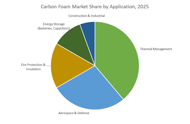Thermal management represents around 35% of total carbon foam demand because carbon foam uniquely functions as a “thermal sponge”, capable of absorbing, spreading, and dissipating extreme heat loads faster than any competing lightweight material. In 2025-spec systems, graphite-based foams demonstrate bulk thermal conductivity of 120–180 W/m·K, outperforming aluminum foams by an order of magnitude and redefining cooling architectures for EV inverters, power electronics, and high-density data infrastructure. This performance translates directly into system-level value: EV pilot programs integrating carbon foam into battery modules reported a 15% extension in cell life, driven by faster heat evacuation during aggressive fast-charging regimes (≥4C). At the high end, foam-based heat exchangers have demonstrated heat-flux handling above 2,200 W/cm², a threshold that positions carbon foam as a critical enabler for next-generation laser systems, GaN/SiC RF modules, and compact 5G base stations. Equally important for aerospace and defense buyers is fluid efficiency—carbon foam’s up to 96% open-cell porosity reduces pressure drop in liquid-cooled systems by as much as 300%, allowing smaller pumps, lower parasitic losses, and lighter thermal loops. These combined thermal, fluidic, and weight advantages explain why thermal management remains the largest and most value-dense application segment in the carbon foam market.
