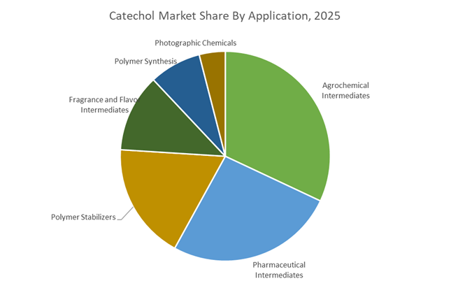 Agrochemical intermediates account for 32% of catechol demand in 2025, anchored by carbamate insecticides, phenoxy herbicides, and plant growth regulators, with seasonal volumes tied to crop cycles and commodity pricing, and generic production concentrated in India and China. Pharmaceutical intermediates follow, leveraging catechol derivatives in bronchodilators, methyldopa-class antihypertensives, and anti-Parkinson’s drugs, where high-purity inputs command premiums. Polymer stabilizers form a significant segment, using catechol as an antioxidant and polymerization inhibitor across polyolefins, polyamides, adhesives, and epoxy systems to extend service life in automotive and industrial components. Fragrance and flavor intermediates are a growing specialty outlet via guaiacol, vanillin, and piperonal pathways, while polymer synthesis remains niche for high-performance resins. Photographic chemicals continue structural decline, limited to residual specialty printing and medical X-ray applications.