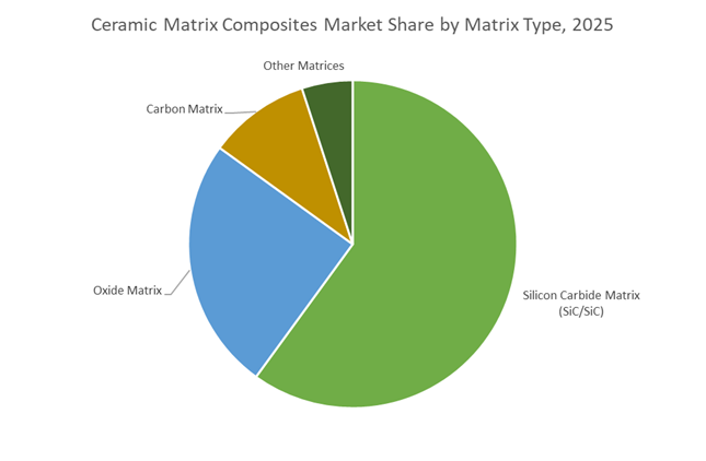 Silicon Carbide Matrix (SiC/SiC) ceramic matrix composites hold the dominant market share—approximately 60% in 2025—because they deliver the highest combination of temperature tolerance, structural strength, and weight reduction essential for modern aerospace propulsion systems. Unlike oxide or carbon-matrix CMCs, SiC/SiC maintains mechanical integrity at temperatures exceeding 1,400°C, enabling its use in the hottest zones of gas turbine engines where metallic superalloys reach their thermal limits. The material’s low density—roughly one-third that of nickel-based superalloys—translates into substantial reductions in engine mass, particularly in rotating components, which directly improves fuel economy, reduces emissions, and increases thrust-to-weight ratios. SiC/SiC also provides exceptional resistance to oxidation, corrosion, and thermal shock, supporting reliable performance during rapid throttle changes and prolonged exposure to high-velocity combustion gases. With major engine platforms already integrating SiC/SiC turbine shrouds, combustor liners, and other hot-section components, the technology has progressed from R&D into serial production, solidifying its leadership in the global CMCs market. As aerospace propulsion systems push toward hotter, lighter, and more efficient designs—including hydrogen-capable engines and hybrid-electric propulsion—SiC/SiC remains the preferred material for next-generation high-temperature components.