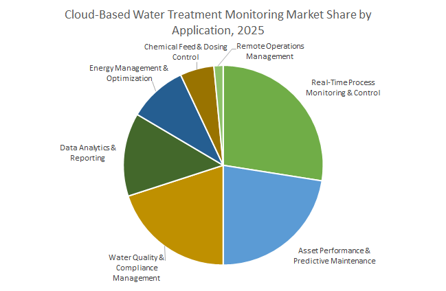 Real-Time Process Monitoring & Control (26.9%) is the largest application, offering situational awareness of flows, pressures, and tank levels across facilities. Asset Performance & Predictive Maintenance (22.5%) enables utilities to anticipate pump, motor, and instrument failures, avoiding costly downtime. Water Quality & Compliance Management (20.9%) automates reporting and ensures regulatory compliance. Data Analytics & Reporting (13.2%) converts raw operational data into actionable insights, informing capital planning and operational improvements. Energy Management & Optimization, Chemical Feed Control, and Remote Operations further enhance efficiency, cost savings, and operational flexibility. Together, these applications illustrate the transformative impact of cloud computing on water treatment operations.