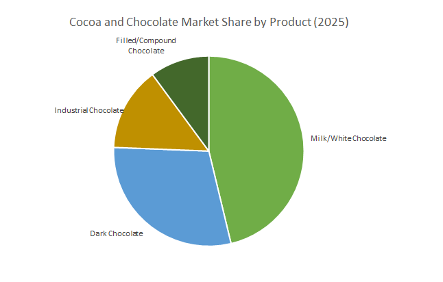 Milk and White Chocolate collectively hold the largest market share at 45.1% in 2025, driven by their widespread use in confectionery, snacks, and desserts. Their creamy texture and mass-market appeal make them a preferred choice among consumers globally. Industrial Chocolate maintains steady growth as it serves bakery, coating, and processed food applications, while Filled and Compound Chocolate cater to cost-sensitive segments and emerging markets. Dark Chocolate emerges as the fastest-growing category with a CAGR of 4.8%, fueled by health-conscious consumers seeking products rich in antioxidants, low sugar content, and clean-label formulations.