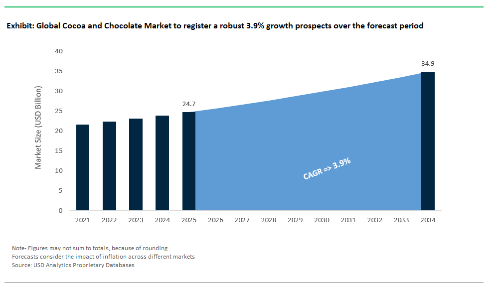 The global cocoa and chocolate market is valued at $24.7 billion in 2025 and is projected to reach $34.9 billion by 2034, registering a CAGR of 3.9% during the forecast period.