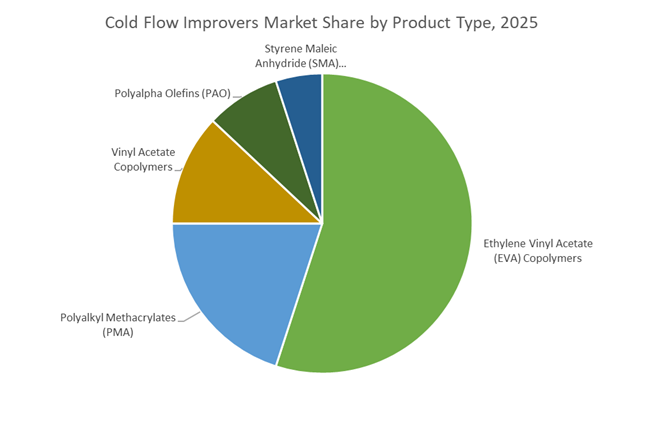 Ethylene Vinyl Acetate (EVA) copolymers lead the Cold Flow Improvers Market with 55% share in 2025, serving as the industry benchmark for modifying wax crystal morphology in middle distillate fuels. Their proven ability to improve cold filter plugging point (CFPP) and pour point across diesel and biodiesel blends makes EVA the preferred choice for refinery-scale fuel conditioning. Polyalkyl methacrylates (PMA) represent the second-largest segment, valued for dual functionality, delivering both cold flow performance and lubricity enhancement that protects fuel injection systems during winter operation. Vinyl acetate copolymers are gaining traction alongside rising FAME blending mandates, as they effectively manage complex wax structures in biodiesel-rich fuels. Styrene maleic anhydride (SMA) copolymers and polyalpha olefins (PAO) occupy niche positions, primarily used in premium additive packages and extreme cold formulations such as arctic-grade diesel and aviation turbine fuels requiring ultra-low temperature operability.