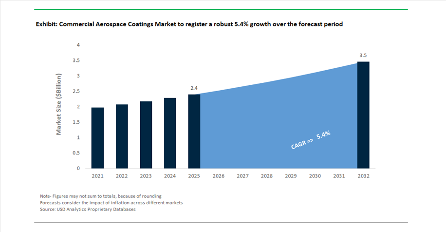 The global commercial aerospace coatings market was valued at $2.4 billion in 2025 and is projected to grow at a CAGR of 5.4% between 2025 and 2032, reaching $3.5 billion by 2032. This growth is driven by rising demand across aircraft OEM production, maintenance, repair and overhaul (MRO) activities, and fleet modernization programs, where coatings play a critical role in ensuring corrosion resistance, UV protection, weight optimization, and aerodynamic efficiency.