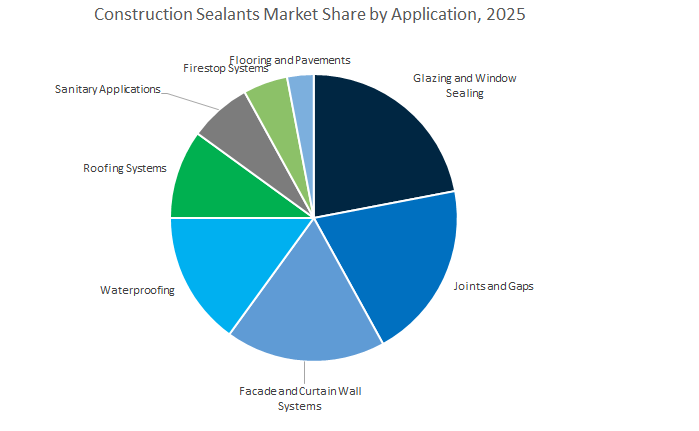 The Glazing and Window Sealing segment dominates the global construction sealants market with a projected 22.9% share in 2025, closely followed by Joints and Gaps at 19.4%. Glazing sealants are indispensable for bonding and weatherproofing glass elements in both residential and commercial buildings, particularly in modern curtain wall and structural glazing systems, which require long-lasting adhesion, UV resistance, and elasticity. High-performance silicone and polyurethane sealants are the backbone of this segment due to their durability and resistance to temperature and moisture extremes.