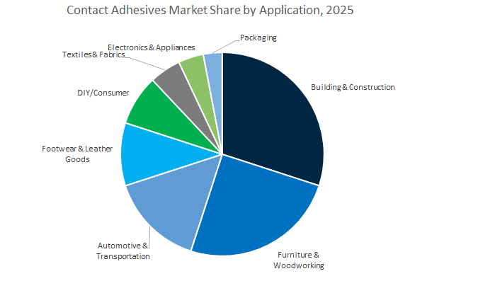 The building & construction segment dominates the global contact adhesives market, accounting for 33.4% of the projected 2025 share, driven by its extensive use in flooring, countertop lamination, panel bonding, and HVAC duct assembly. Contact adhesives are indispensable in construction due to their instant tack, high bond strength, and versatility across diverse materials such as wood, plastic laminates, metal, and rubber. They enable rapid installation with minimal clamping time, a crucial advantage for commercial and residential projects where productivity and reliability are essential. Furthermore, the increasing adoption of modular and prefabricated building techniques is bolstering demand for high-performance solvent-based and water-borne contact adhesives that can deliver strong bonds in controlled factory environments.