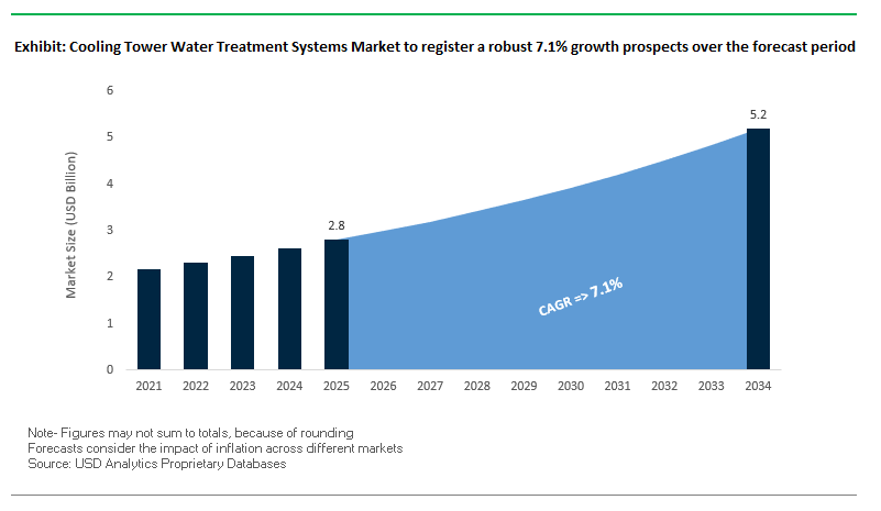 The global cooling tower water treatment systems market is forecast to grow from USD 2.8 billion in 2025 to USD 5.2 billion by 2034, reflecting a CAGR of 7.1%. Growth is primarily driven by water scarcity concerns, digital monitoring adoption, and stricter regulatory frameworks for Legionella prevention and discharge compliance.