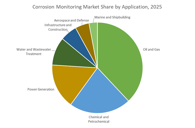 Oil and gas represents 38% of corrosion monitoring demand, reflecting extreme operating environments across upstream production, long-distance pipelines, and high-temperature refining units exposed to CO2, H2S, and aggressive process fluids. Chemical and petrochemical facilities follow closely, where monitoring is essential to prevent catastrophic releases and unplanned shutdowns in high-pressure systems handling corrosive compounds. Power generation relies on corrosion monitoring to protect boilers, condensers, and cooling circuits, with nuclear plants integrating monitoring tightly into regulatory safety frameworks. Water and wastewater utilities deploy monitoring to manage internal corrosion from aggressive water chemistry and external degradation of buried assets. Infrastructure and construction applications focus on bridges, storage tanks, and reinforced concrete, prioritizing long-term structural health. Aerospace, defense, marine, and shipbuilding represent specialized segments, demanding high-reliability monitoring for aircraft structures, naval vessels, and offshore assets operating in highly corrosive environments.