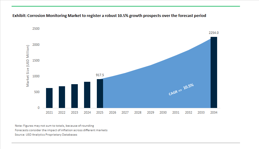 The Corrosion Monitoring Market is valued at $917.5 million in 2025 and is forecast to reach $2,253.5 million by 2034, expanding at a CAGR of 10.5%. Growth is fueled by refinery digitalization, subsea asset integrity programs, CCUS infrastructure expansion, and regulatory mandates in municipal water systems. Continuous sensor-based monitoring is replacing manual inspection models.