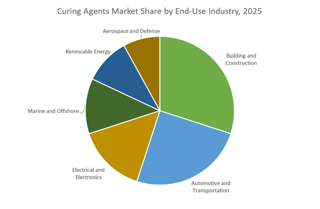 Building and construction leads curing agent consumption with 30% market share, fueled by demand for concrete repair materials, industrial flooring, structural adhesives, and protective coatings, where ambient-curing chemistries enable efficient on-site application. Automotive and transportation represent a significant segment, combining elevated-temperature curing for OEM production with ambient systems for refinish and repair operations. Electrical and electronics applications require ultra-high-purity curing agents for printed circuit boards, encapsulation compounds, and conductive adhesives, favoring thermal and UV curing for precision and void-free performance. Marine and offshore rely heavily on ambient-curing epoxy systems for corrosion protection in saltwater environments. Renewable energy is expanding rapidly, driven by epoxy composites in wind turbine blades and encapsulation materials for solar modules. Aerospace and defense demand elevated-temperature curing under strict quality control for carbon fiber composites and flight-critical structural components.