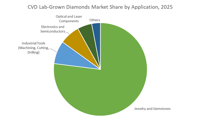 Jewelry and gemstone applications represent approximately 80% of total demand in the CVD Lab-Grown Diamonds Market, making this segment the unequivocal demand anchor. This dominance reflects a structural shift in consumer behavior, where lab-grown diamonds are transitioning from niche ethical alternatives to mainstream luxury and fashion products. A dramatic wholesale price correction over the past several years has repositioned CVD diamonds into a predictable, cost-plus retail model, enabling brands to offer larger stones at a fraction of the price of mined equivalents. Market share is further amplified by changing consumer preferences toward larger carat sizes, as improved reactor yields and lower production costs have made 2–4 carat stones commercially viable for mass-market jewelry. Standardized per-carat pricing has reduced volatility and inventory risk for retailers, encouraging broader adoption across omnichannel jewelry platforms. In addition, the predictable geometry of CVD-grown rough allows for superior cut consistency, resulting in a higher proportion of stones achieving top-tier cut grades—a critical determinant of visual appeal and consumer confidence. As accessibility, size, and design flexibility increasingly define purchasing decisions, jewelry applications remain the primary growth engine sustaining CVD diamonds’ market dominance.