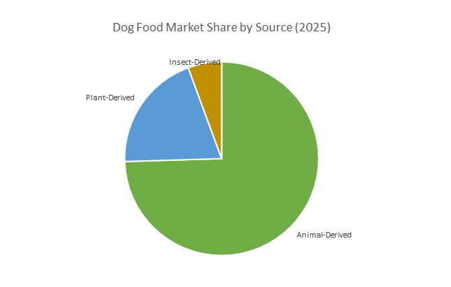 Animal-Derived ingredients dominate the market, accounting for the largest share of 74.8% in 2025, supported by their essential amino acid profile and alignment with dogs’ natural dietary requirements. This category continues to anchor mainstream formulations, including premium and grain-free diets. Plant-Derived sources, including pea protein and lentil-based recipes, are steadily gaining traction with the rise of vegan pet food trends and eco-conscious consumers seeking sustainable options. Insect-Derived protein, though a niche today, is the fastest-growing source with an impressive CAGR of 6.9%, driven by sustainability initiatives and regulatory approvals for alternative protein sources such as black soldier fly larvae. These proteins not only offer a high-quality amino acid profile but also present an environmentally friendly solution amid global concerns over resource-intensive meat production.