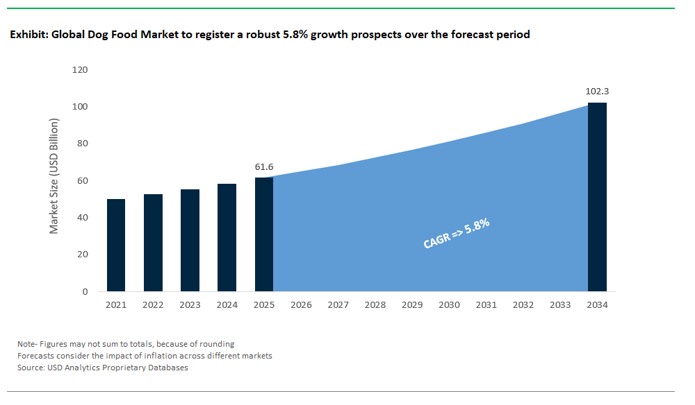 The global dog food market is valued at $61.6 billion in 2025 and is projected to reach $102.3 billion by 2034, growing at a CAGR of 5.8% during the forecast period.