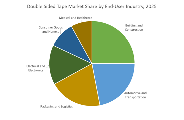 The building and construction sector represents 25% of total double sided tape consumption, making it the largest end-user industry in 2025. Demand is driven by widespread use in architectural cladding, window installation, signage, floor marking, and temporary fastening during construction activities. Foam-backed tapes are increasingly replacing screws and rivets, delivering improved aesthetics, reduced installation time, and enhanced load distribution. Automotive and transportation applications form a major secondary segment, utilizing double sided tapes for trim attachment, mirror bonding, emblem mounting, and interior assembly to reduce vehicle weight and eliminate corrosion risks. Packaging and logistics rely heavily on paper-backed and transfer tapes for carton sealing and pallet stabilization in high-volume operations. Electrical and electronics manufacturing continues to expand tape usage for display mounting and battery attachment, while medical and healthcare applications remain specialized, demanding biocompatibility, sterilization resistance, and regulatory compliance.