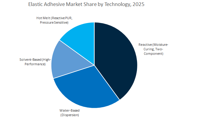 Reactive systems—comprising moisture-curing polyurethanes (PU), silane-modified polymers (SMP), and two-component systems—represent the largest share of the global elastic adhesive industry, accounting for approximately 40.6% of the market in 2025. These systems dominate due to their ability to form high-strength, flexible, and weather-resistant bonds that maintain elasticity even under thermal expansion, vibration, or mechanical stress. Reactive adhesives are indispensable in construction and transportation, particularly for structural glazing, façade bonding, and sealing expansion joints, where long-term adhesion and UV resistance are critical. In the automotive sector, they enable lightweighting by replacing mechanical fasteners and welding in body panel assembly and window bonding applications. The strong growth of hybrid polymer systems, such as SMPs (Silane-Modified Polymers), has further boosted the reactive segment’s dominance, offering the combined benefits of polyurethane toughness and silicone flexibility without isocyanates. Their superior weatherability, chemical resistance, and long service life continue to make reactive elastic adhesives the preferred choice across industrial and commercial environments requiring structural integrity and environmental resilience.