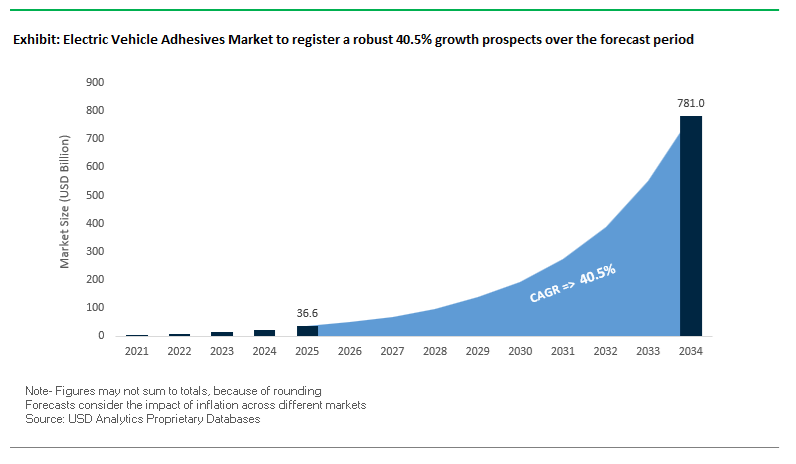 The electric vehicle adhesives market has become a strategic growth arena as OEMs redesign vehicle architectures around electrification, lightweighting, and high-voltage safety. The market is projected to expand from USD 36.6 billion in 2025 to USD 780.9 billion by 2034, reflecting an exceptional CAGR of 40.5% driven by rapid EV penetration and a fundamental rethinking of joining technologies. Adhesives are no longer auxiliary materials; they are central to vehicle performance, influencing mass reduction, battery range, crash behavior, and thermal stability. As EV platforms shift toward mixed-material architectures and large-format battery packs, adhesive solutions are increasingly specified at the platform-design stage rather than selected post-engineering.