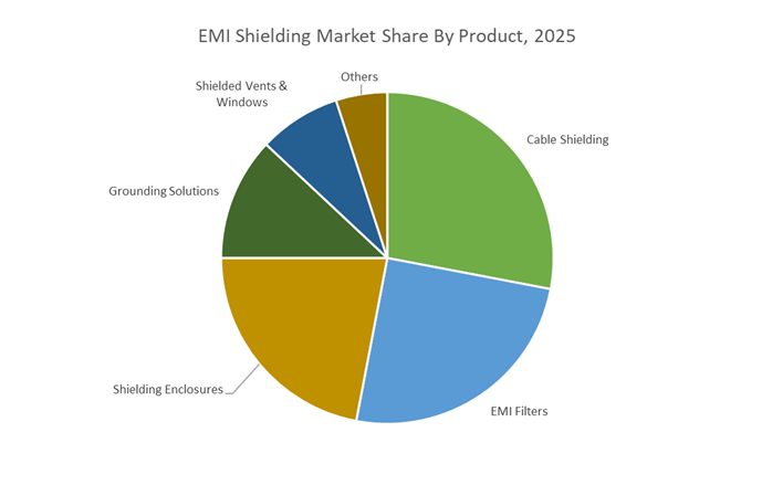Conductive polymers, conductive coatings, EMI absorbers, and conductive elastomers are gaining rapid traction due to their lightweight, thin-profile, and multifunctional capabilities. These materials are increasingly replacing traditional metal shielding in EVs, smartphones, and wearables. Polymer composites enhanced with graphene or carbon nanotubes are especially attractive for high-frequency and sustainable designs. The shift reflects OEM demand for EMI solutions that also support thermal management and recyclability.