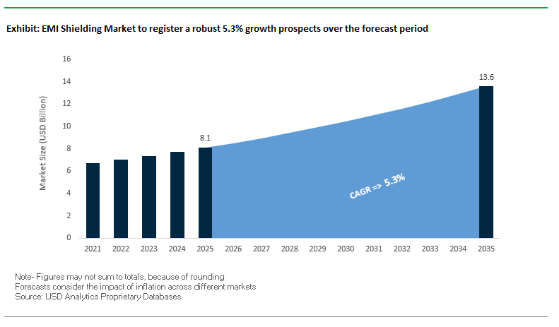 The global EMI Shielding Market is projected to grow from USD 8.1 billion in 2025 to USD 13.6 billion by 2035, registering a CAGR of 5.3% (2025–2035). The growth trajectory reflects surging design complexity in 5G/mmWave infrastructure, rapid proliferation of autonomous and connected vehicles, stringent defense and aerospace HEMP compliance, and the miniaturization of consumer, medical and industrial electronics.