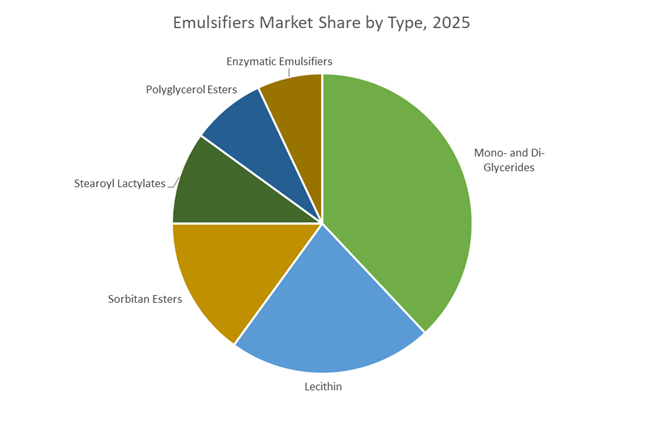 Mono- and di-glycerides command 38% of total emulsifier market share in 2025, reflecting their extensive use in bakery, confectionery, margarine, ice cream, and processed foods. Their cost-effectiveness, multifunctionality, and broad regulatory acceptance position them as foundational ingredients for improving texture, volume, crumb structure, and shelf life. Lecithin maintains a strong market position, particularly soy and sunflower variants, benefiting from clean-label trends and demand for naturally derived emulsifiers in chocolate, bakery, and personal care formulations. Sorbitan esters play a vital role in stabilizing oil-in-water and water-in-oil emulsions across food, cosmetics, and pharmaceutical products. Stearoyl lactylates remain important in bakery applications for gluten strengthening and dough conditioning. Polyglycerol esters are gaining traction in reduced-fat and heat-stable formulations, while enzymatic emulsifiers represent an emerging premium segment aligned with sustainability, precision functionality, and label-friendly positioning.