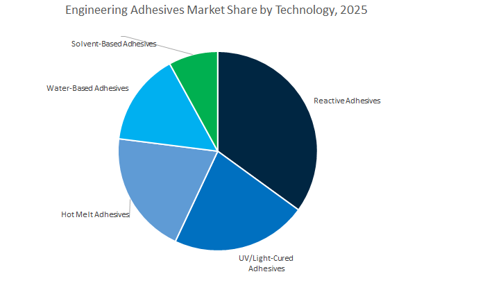 Reactive adhesives remain the cornerstone of the engineering adhesives market, accounting for the largest share due to their unparalleled mechanical performance, chemical resistance, and versatility. These adhesives cure through chemical reactions—such as moisture, heat, or catalyst activation—forming strong, permanent bonds capable of withstanding high mechanical stress, vibration, and environmental exposure. Their dominance is rooted in wide-ranging adoption across automotive, aerospace, construction, and industrial equipment manufacturing, where structural bonding and high durability are paramount. Epoxy, polyurethane, and acrylic-based reactive adhesives are particularly valued in applications like composite bonding, metal assembly, and structural reinforcement. In addition, two-component (2K) formulations are favored for precision-engineered systems, offering controlled curing and superior adhesion to dissimilar substrates. The shift toward lightweight and multi-material joining in EVs and aircraft is reinforcing the demand for reactive systems, which offer better fatigue resistance and corrosion protection compared to mechanical fasteners. As global manufacturers emphasize sustainability, low-VOC and solvent-free reactive formulations are gaining prominence, enabling compliance with environmental standards while maintaining performance excellence.