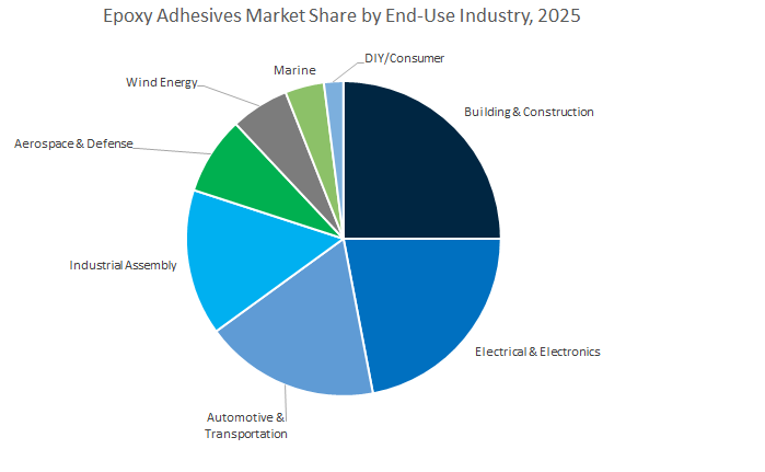 Two-component epoxy adhesives represent the largest and most versatile segment in the global epoxy adhesives industry, commanding a projected 58.5% market share in 2025. These systems—comprising separate resin and hardener components—provide unmatched flexibility in formulation, enabling control over working time, cure rate, and bond strength. Their superior mechanical properties, chemical resistance, and ability to cure at room temperature make them indispensable in construction, industrial assembly, marine, and energy applications. In infrastructure repair, they are the adhesive of choice for crack injection, concrete anchoring, and steel bonding, while in manufacturing, they are used for equipment assembly and heavy-duty composite joining. The two-part systems are particularly valued for their structural integrity and long-term durability, even under dynamic loads or thermal cycling. Moreover, the expanding use of low-VOC and solvent-free formulations aligns with environmental compliance requirements, further strengthening their adoption across industrialized and emerging markets alike. As industries increasingly shift toward lightweight materials and mixed-substrate bonding, two-component epoxies continue to lead the market due to their ability to bond metals, composites, and plastics with equal efficiency.