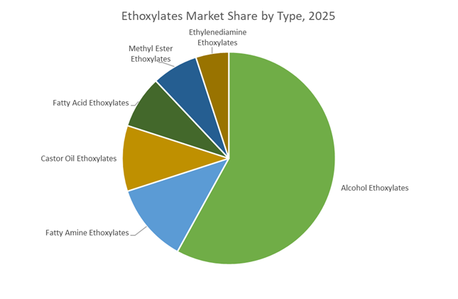Alcohol ethoxylates command approximately 58% of total ethoxylates market share in 2025, reflecting their status as the primary non-ionic surfactants for detergents, household cleaners, and industrial formulations. Their strong wetting, emulsifying, and detergency characteristics, combined with favorable biodegradability profiles, make them indispensable in laundry, dishwashing, and hard surface cleaning products. Fatty amine ethoxylates represent a significant secondary segment, valued for corrosion inhibition and antistatic performance in agrochemicals, textiles, and metalworking. Castor oil ethoxylates maintain importance in personal care and pharmaceutical applications where mildness and compatibility with sensitive ingredients are required. Fatty acid ethoxylates remain steady in industrial emulsification, while methyl ester ethoxylates are gaining traction as sustainable alternatives in detergents. Ethylenediamine ethoxylates serve niche roles in chelation and dispersion for specialty chemical applications.