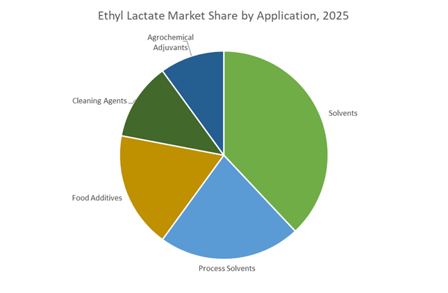 Solvents account for 38% of ethyl lactate demand in 2025, positioning this segment as the primary growth engine for the market. Ethyl lactate is increasingly adopted as a high-performance, biodegradable alternative to NMP, toluene, and chlorinated solvents in coatings, printing inks, and industrial cleaning due to its strong solvency for cellulose derivatives, resins, and polymers. Process solvents represent a significant secondary segment, particularly in pharmaceutical and fine chemical manufacturing, where ethyl lactate functions as a reaction medium and extraction solvent aligned with green chemistry initiatives. Food additives maintain an important share, supported by ethyl lactate’s GRAS status and use as a flavoring agent and food-grade extraction solvent. Cleaning agents are expanding rapidly, leveraging ethyl lactate in degreasers and precision cleaners for its oil-dissolving capability and user safety profile, while agrochemical adjuvants remain a niche but strategic application.