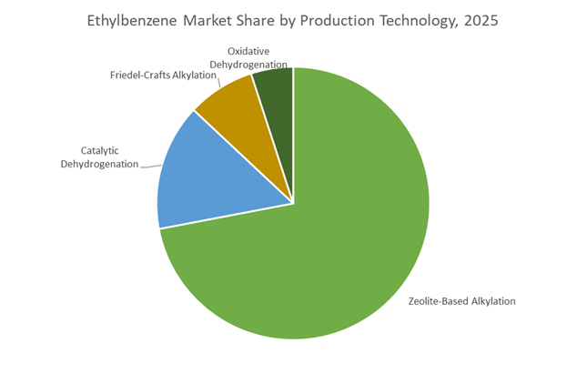 Zeolite-based alkylation commands 72% of ethylbenzene production capacity in 2025, reflecting its status as the industry-standard technology for reacting benzene with ethylene. Solid zeolite catalysts deliver high selectivity, reduced corrosion, elimination of liquid acid waste, and improved energy efficiency, driving widespread adoption across modern petrochemical complexes. Legacy Friedel–Crafts alkylation continues to decline due to aluminum chloride waste handling and operational challenges, persisting mainly in older facilities. Catalytic dehydrogenation appears in integrated sites where ethylbenzene production is directly linked to styrene units, while oxidative dehydrogenation remains an emerging pathway aimed at improving energy efficiency in styrene conversion. Overall, sustainability mandates and operating cost optimization continue to accelerate migration toward zeolite-based ethylbenzene production technologies.
