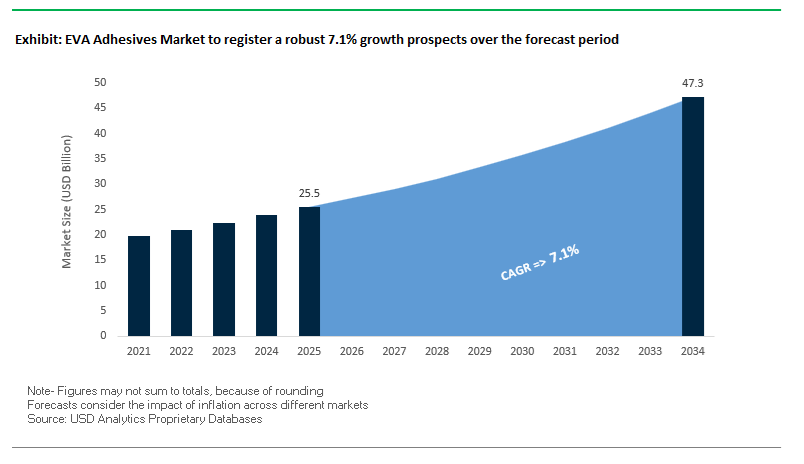 The Global EVA Adhesives Market is projected to expand from USD 25.5 billion in 2025 to USD 47.3 billion by 2034, advancing at a CAGR of 7.1%, as EVA-based bonding systems continue to scale across packaging, footwear, photovoltaic modules, and construction. Growth is structurally driven by EVA’s ability to balance processability, thermal stability, flexibility, and cost efficiency while remaining compliant with tightening VOC and odor regulations. As OEMs and converters pursue higher line speeds, lower application temperatures, and recyclable or low-emission material stacks, EVA adhesives—particularly hot melts and encapsulation grades—are increasingly specified as baseline solutions rather than secondary options. The market is simultaneously shifting toward higher vinyl acetate (VA) content grades, low-odor formulations, and bio-compatible copolymers, aligning EVA chemistry with circular economy and sustainability mandates without disrupting existing manufacturing infrastructure.