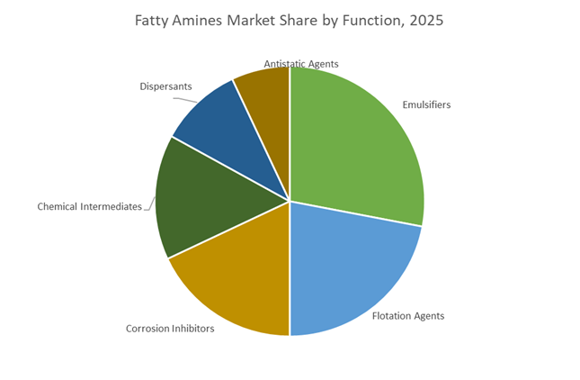 Emulsifiers account for 28% of total fatty amines market share in 2025, reflecting their critical role in stabilizing oil–water systems across agrochemicals, personal care, and industrial formulations. Fatty amines are widely used in pesticide concentrates, herbicide emulsions, and cosmetic creams due to their cationic surface activity and ability to reduce interfacial tension. Flotation agents form the second-largest functional segment, driven by mineral beneficiation in potash, phosphate, and iron ore processing where primary amines and ether amines act as selective collectors. Corrosion inhibitors maintain strong demand in oil and gas, water treatment, and metalworking fluids, forming protective films on steel surfaces. Chemical intermediates support downstream production of quaternary ammonium compounds and specialty surfactants, while dispersants are gaining momentum in paints, coatings, inks, and drilling fluids. Antistatic agents remain niche, serving plastics and textiles where static control improves handling and product quality.