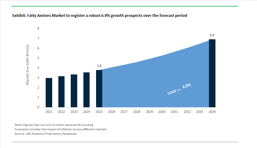 The global Fatty Amines Market is projected to expand from $3.8 billion in 2025 to $6.9 billion by 2034, advancing at a CAGR of 6.9%. Growth is being driven by rising consumption of primary, secondary, and tertiary fatty amines across agrochemicals, water treatment chemicals, personal care surfactants, oilfield chemicals, polyurethane catalysts, epoxy curing agents, and pharmaceutical intermediates. Regulatory pressure to reduce carbon intensity in chemical manufacturing, expansion of renewable feedstocks, and increasing demand for high-purity amine derivatives in disinfectants and specialty coatings are accelerating capital investment in capacity additions and bio-attributed production systems. Market participants are focusing on regional production hubs to reduce logistics emissions and secure supply chains amid growing demand in North America, Europe, India, and Southeast Asia.